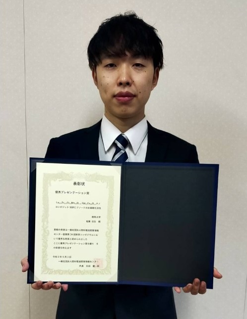 令和3年9月1日~3日にオンライン開催された日本セラミックス協会第34回秋季シンポジウムにおいて、環境創生理工学教育プログラム博士前期課程2年の稲葉 佳生さん(佐藤・神成研究室)が「FCDIC優秀プレゼンテーション賞」を受賞しました。発表題目は“La0.75Sr0.25Cr0.5Mn0.5O3-d/ Gd0.2Ce0.8O1.9ナノコンポジットSOFCアノードの水素酸化活性”であり、固体酸化物燃料電池の超高効率化を実現するキーアイテムとして注目される酸化物アノードにおいてコロイドプロセスをベースとした電極のナノコンポジット化により反応場の密度を大幅に増大させ、従来の金属系アノードに比べて水素酸化活性に劣る酸化物であるにも関わらず、最新鋭のNiサーメットと同等以上の水素酸化反応速度の実現に成功しました。