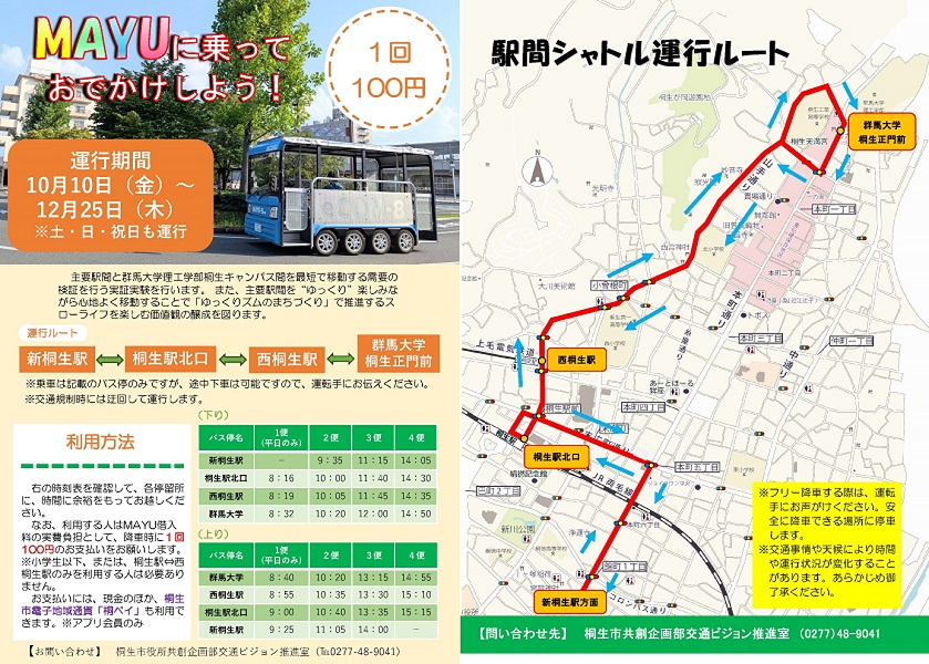 主要駅間と桐生キャンパス間をMAYUが運行します