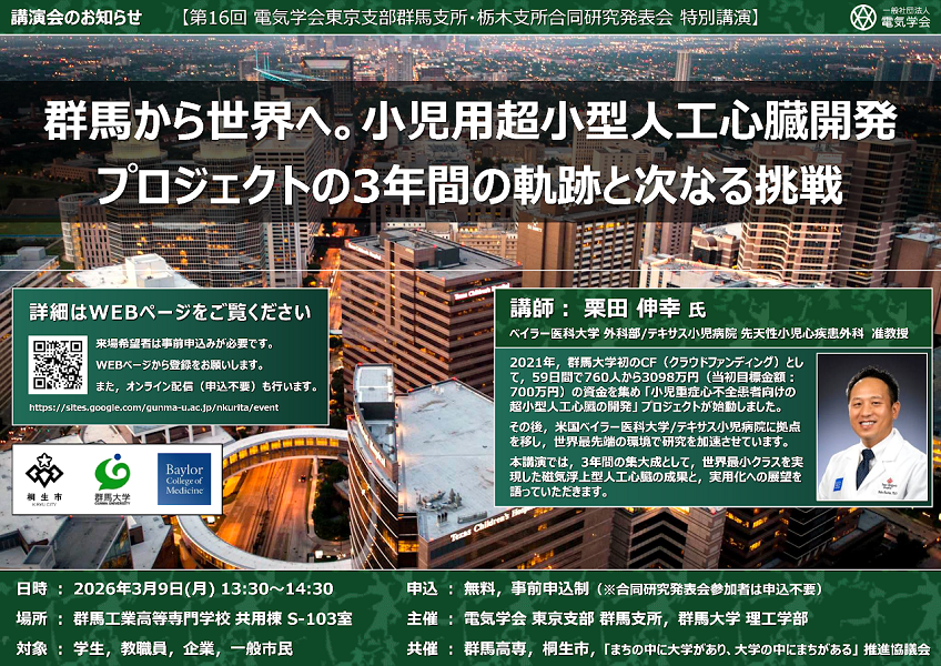 ・日 時:2026年3月9日(月)13:30~14:30演題:群馬から世界へ。小児用超型人工心臓開発 プロジェクトの 3年間の軌跡と次なる挑戦