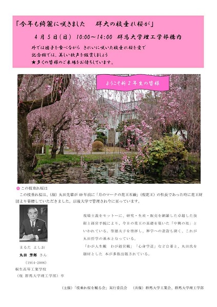 桐生キャンパスで「しだれ桜を観る会」を開催いたします。当日は、同窓記念会館講堂にて、コーラスのミニコンサートを行います。入場無料ですので、お気軽にお立ち寄りください! また、さくら句会を行います。投句希望の方は、当日、受付にてご案内いたします。ご参加お待ちしております! 群馬大学工業会ホームページはこちら