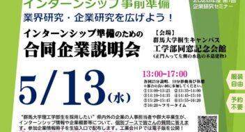 “群馬大学理工学部生と出会いたい”という県内外の企業が集結して、 群大理工学生のための就職支援イベントを開催します! 会場に各社ブースを構え、企業概要やインターンシップ受入れなどの最新情報を個別にプレゼンします。 本学卒 …