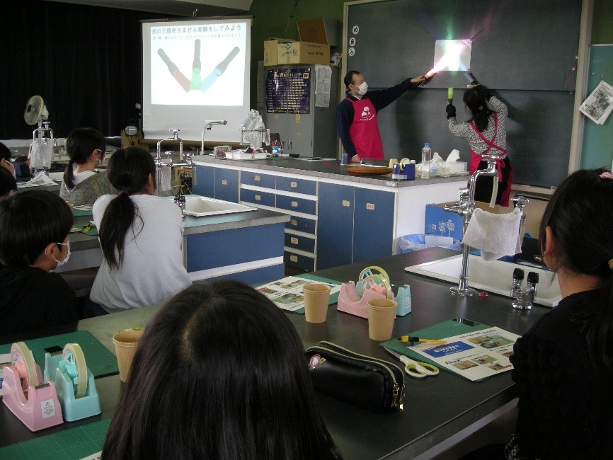 桐生市立南小学校の親子行事において、偏光万華鏡をテーマに出前授業を実施しました。授業の前半では、偏光板万華鏡に関連する光の実験を行い、後半では偏光板万華鏡の作製指導をしました。
