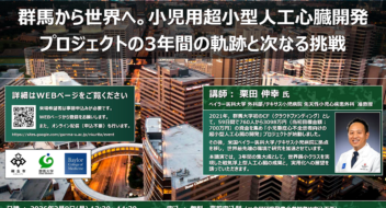 〈演題・講師〉 演題:群馬から世界へ。小児用超型人工心臓開発 プロジェクトの 3年間の軌跡と次なる挑戦 講師:栗田 伸幸(ベイラー医科大学 外科部 テキサス小児病院 先天性小児心疾患外科 准教授 〈概要〉 ・日 時:2 …