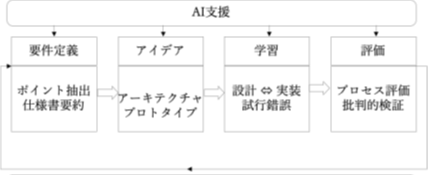 1)。要件定義フェーズでは、課題解決に必要な仕様をAIと共に詰めたり、複雑な仕様をAIで要約したりすることにより、学生が課題解決に必要な項目(仕様)を理解する速度が大幅に向上する。アイデアフェーズでは、AIがアーキテクチャの提案やプロトタイプを作成し、専門知識の不足による思考の停滞を解消できる可能性が高くなる。学習フェーズでは、バイブコーディング(Vibe Coding)などのAIを使用することで実装と設計を行き来する試行錯誤が可能になる。バイブコーディングは、自然言語でAIに指示をし、コードを生成するプログラミング手法である。(バイブコーディングがあれば「プログラミングを勉強しなくても良い」ことにはならないことに留意する必要がある。)評価フェーズでは、AIからの生成物を学生がどのように昇華させたかというプロセス評価が重要である。AIからの生成物をそのまま使用するのではなく、注意をもって確認し、また批判的に見ることが求められる。単に正解を出力することではなく、AIとの対話を通じて思考を深め、成果物の質を高める過程そのものを評価する。課題としては「動けば良い」で済んでしまうかもしれないが、より良い解決方法を模索する姿勢が学習者に求められる。ここが、AI時代の教育において特に重要な点と考える。