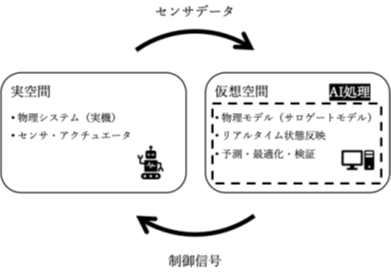 Vibe Codingに代表される自然言語による対話でコードを生成・テスト・洗練させる手法は、研究開発速度を飛躍的に高める。製造、物流、管理、医療等の分野においては、デジタルツインによる仮想検証が重要性を増している。デジタルツインは、実機の状態(実空間)を仮想空間にリアルタイムで再現し、双方向で同期・検証を行う技術である(図